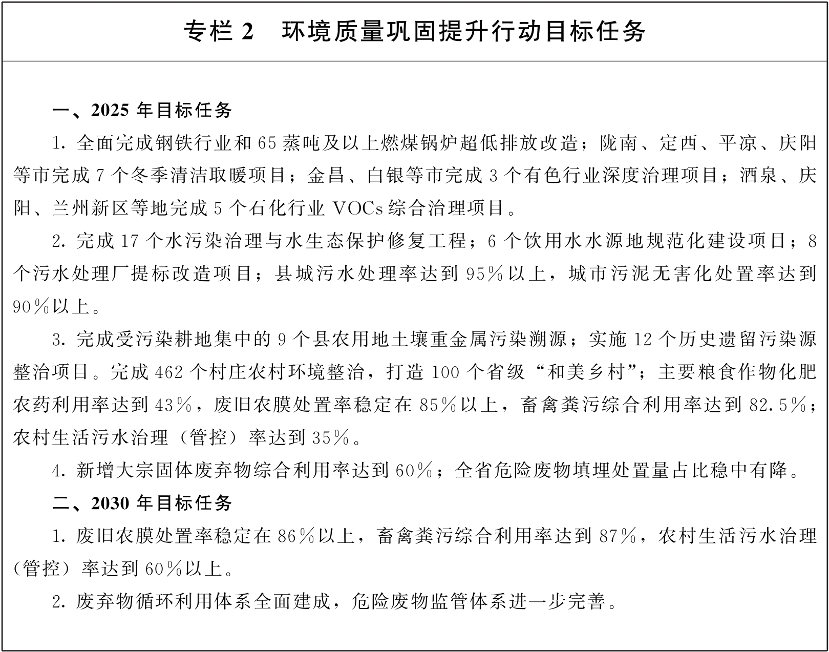 坚持以习近平新时代中国特色社会主义思想为指导,全面贯彻党的二十大和二十届二中、三中全会精神,认真践行习近平生态文明思想,牢固树立绿水青山就是金山银山理念,坚持山水林田湖草沙一体化保护和系统治理,健全并落实祁连山国家级自然保护区生态保护机制、黄河流域生态保护机制、荒漠化综合防治机制,深入开展生态保护修复攻坚、环境质量巩固提升、核与辐射安全强基、监测评估数智赋能、监管执法提质增效、环境风险系统防控、绿色低碳循环发展等专项行动,压茬推进、久久为功,全面提升国家西部生态安全屏障质量,持续增强生态系统服务功能,为维护国家生态安全、推进生态环境治理体系和治理能力现代化、加快建设美丽甘肃奠定坚实生态基础。